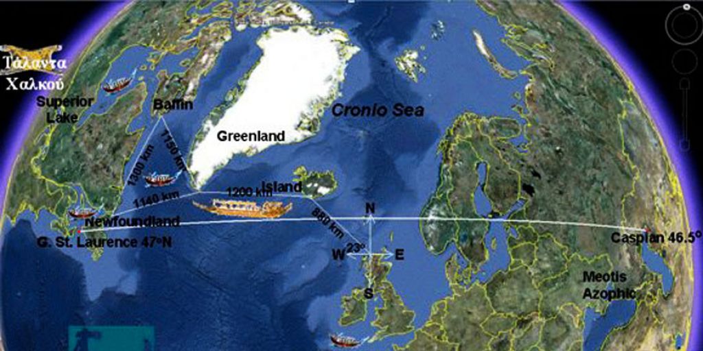 "Plutarch writes:" As to the great continent, from which the great sea is contained in a circle from the other islands is less in distance, but the Ogygia about five thousand stages traveling by boat with oars. (...) from the mainland Greeks residing nearby places around vagina no less than the Maiotida (lake), whose mouth is in line with the mouth of the Caspian Sea. "The distances between Greenland, Newfoundland and Baffin Island in Canada is about 1,140 km, and between Newfoundland and Baffin Island is about 1,300 km A report that around the bay there are Greeks reveals a Greek colony in the Gulf of St. Lawrence.